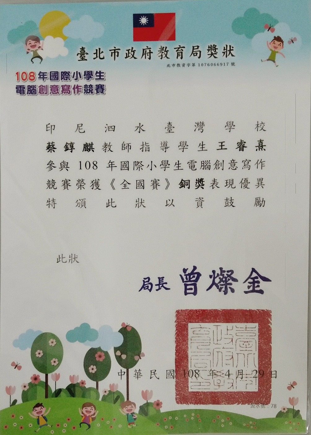 恭喜本校高中閱讀心得寫作、國際小學生電腦創意寫作獲獎。 Posted on May 8, 2019August 22, 2019 by AW 恭喜中學部蔡松穎、謝沛葶、李驊祐參加台灣高中閱讀心得寫作比賽,榮獲甲等。 恭喜小學部G5A王睿熹參加台灣2019年國際小學生電腦創意寫作競賽,榮獲銅獎。